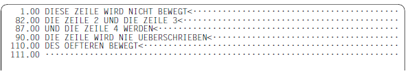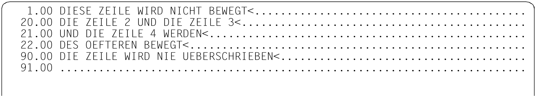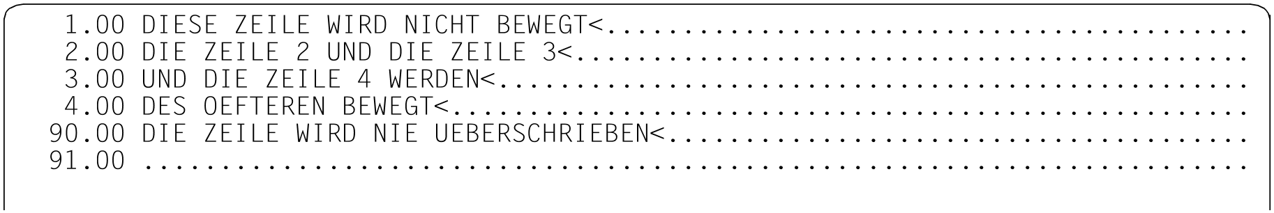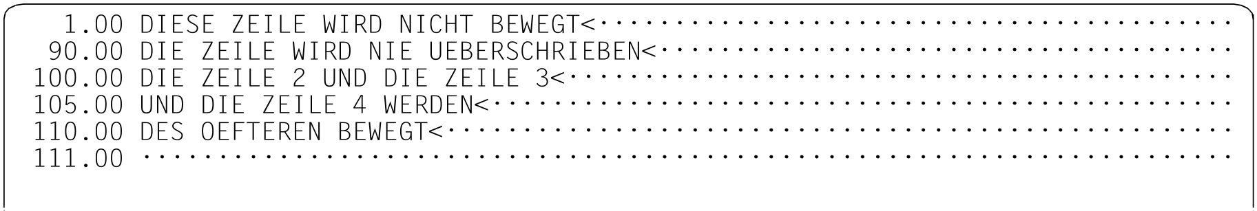 Der Zeilenbereich ab Zeile 100 bis Arbeitsdateiende (100-.$) soll mit der expliziten Schrittweite 5 in den Zeilenbereich ab Zeile 82 übertragen werden. Da als größtmögliche Zeilennummer für den Empfangsbereich 89 festgelegt wurde, wird die Zeile 90 nicht überschrieben.