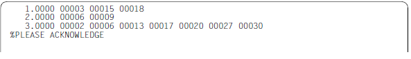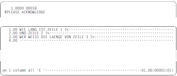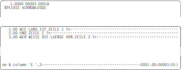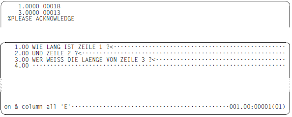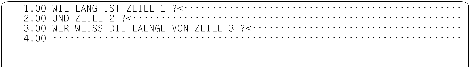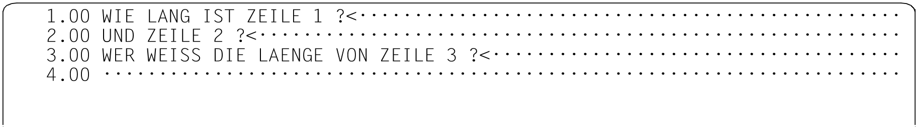 Die ausgegebenen Spaltenwerte sind fünfstellig, da die Länge von Arbeitsdateizeilen bzw. von Zeichenfolgevariablen einen Maximalwert von 32768 Zeichen annehmen kann. In eine Ausgabezeile können bis zu 10 Spaltenangaben geschrieben werden und danach erfolgt ein Umbruch. Die Zeilennummer wird in den Fortsetzungszeilen nicht ausgegeben.