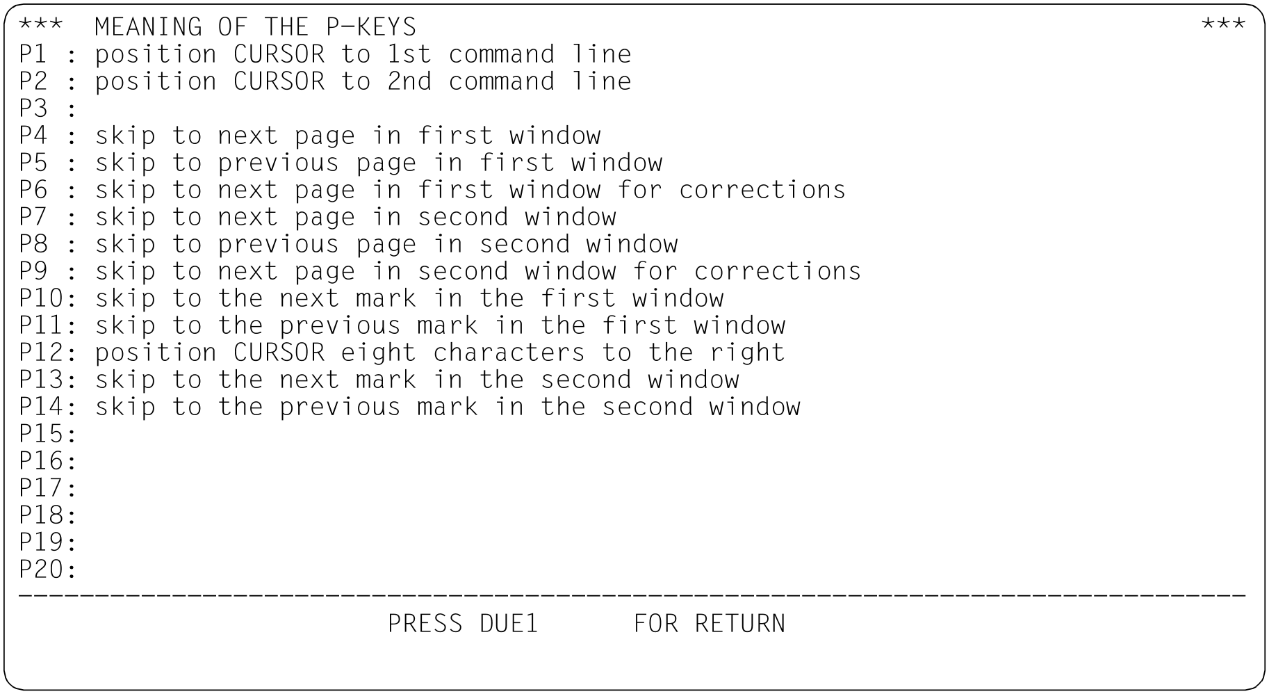 Mit der Anweisung @P-KEYS kann man im Dialogbetrieb die programmierbaren Tasten (P-Tasten) der Tastatur mit einer vom EDT vorgegebenen Standardbelegung laden oder sich die vom EDT vorgegebene Standardbelegung anzeigen lassen.