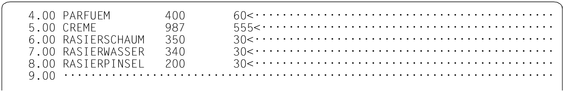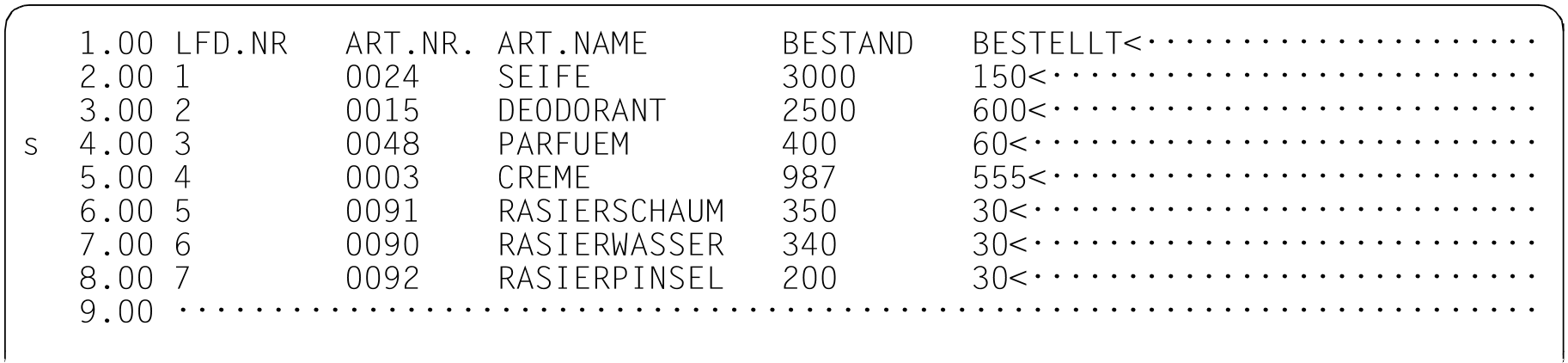 Das Arbeitsfenster soll auf Zeile 4.00 und die Spalte mit der Warenbezeichnung positioniert werden. Im ersten Schritt wird daher S in Zeile 4.00 angegeben.
