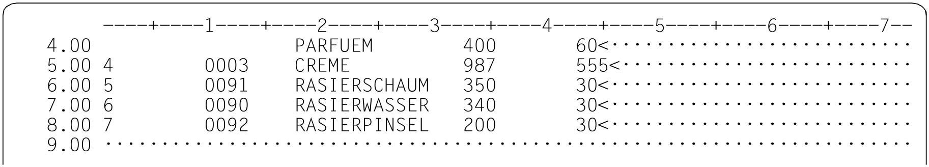 Wird die Zeile im zweiten Schritt nicht verändert, erfolgt keine Spaltenpositionierung. Leerzeichen und evtl. andere eingegebene Zeichen ändern den ursprünglichen Zeileninhalt nicht. Soll innerhalb eines Leerzeichenbereiches positioniert werden, muss an die entsprechende Stelle ein Zeichen ungleich dem Leerzeichen eingegeben werden.