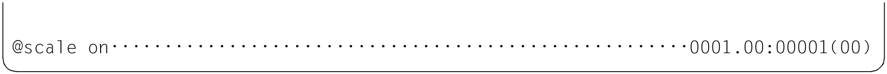 Die Anweisung @SCALE schaltet im F-Modus die Anzeige eines Spaltenzählers (Zeilenlineal) für die aktuelle Arbeitsdatei im Arbeitsfenster ein oder aus (siehe auch den Abschnitt „Das Arbeitsfenster“).