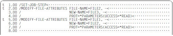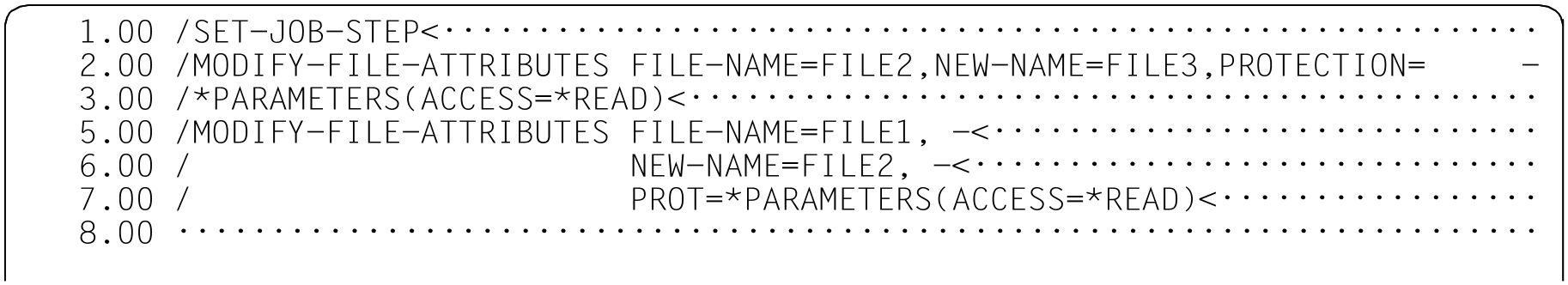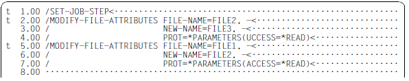Zeilen, die mit '/' oder '//' beginnen und als letztes Zeichen ein Fortsetzungszeichen ('–') enthalten, werden mit der Folgezeile, sofern diese ebenfalls mit '/' bzw. '//' beginnt, verkettet und bei der Bearbeitung der Kurzanweisung T gemeinsam an SDF übergeben. In Fortsetzungszeilen müssen keine T-Kurzanweisungen angegeben werden; die Angabe in der ersten Zeile genügt.