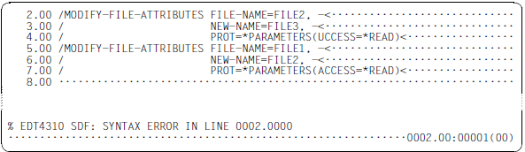 Das geprüfte Kommando bzw. die Anweisung überschreibt das alte Kommando bzw. die Anweisung inklusive aller Folgezeilen in der Arbeitsdatei. Wenn das Kommando bzw. die Anweisung bei der Prüfung durch SDF verändert wurde (z.B. weil in einem vorangegangenen /MODIFY-SDF-OPTIONS-Kommando LOGGING=INVARIANT eingestellt wurde), werden die betroffenen Zeilen neu formatiert und evtl. in mehrere Fortsetzungszeilen aufgeteilt. Das Fortsetzungszeichen wird in der 72. Spalte gesetzt.