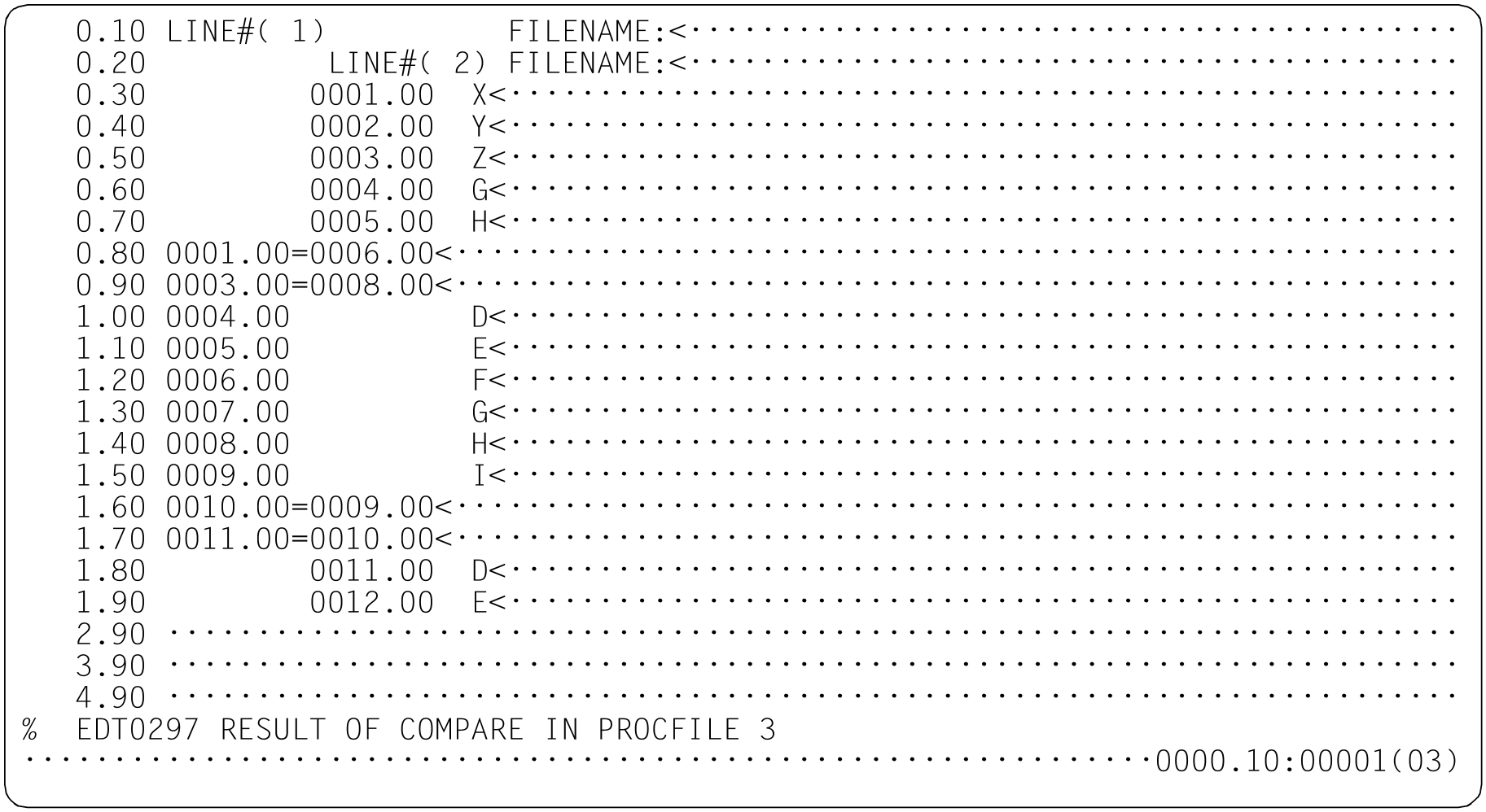 If all the lines to be compared are either identical or different then only the message EDT0291 or EDT0290 respectively is output. In this case, no detailed result of the comparison is output.