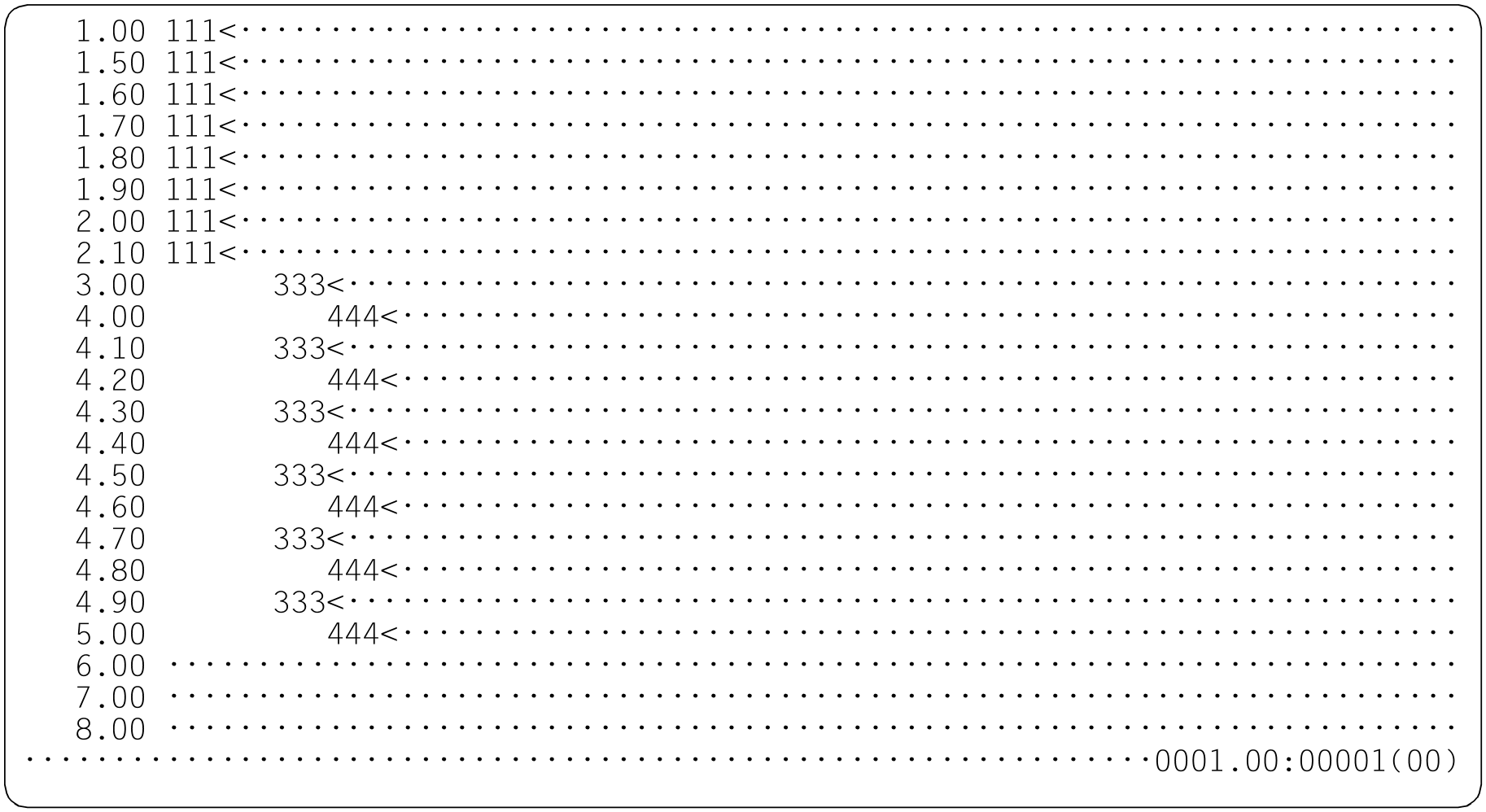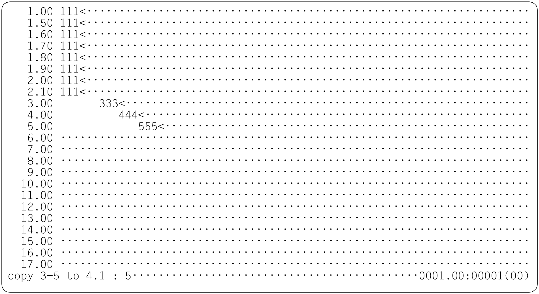 In this case, EDT starts by copying line 1 to line 1.5. This line is located in the specified source range. Consequently line 1.5 is copied to line 1.6 with the implicit increment 0.1. Accordingly, line 1.6 is copied to 1.7, ... , line 1.9 to 2.0 (and the content of line 2 is overwritten) and line 2.0 is then copied to line 2.1.