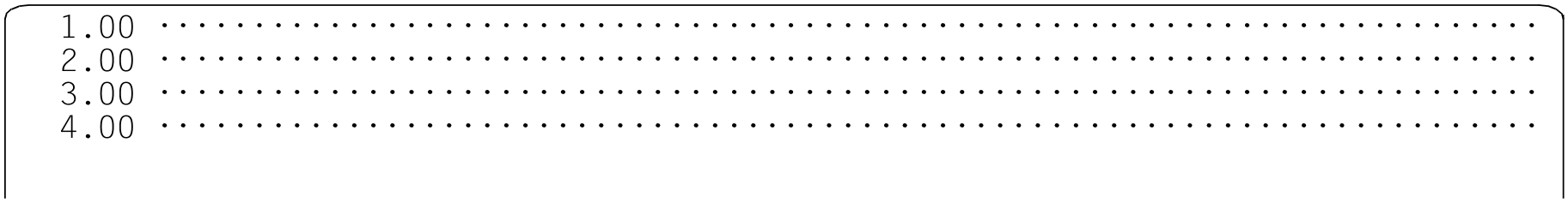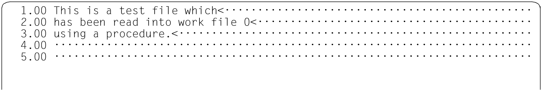 1. @PROC 1 -------------------------------------------------------- (01) 1. @ @CREATE 1: 'THIS IS AN EXAMPLE' 2. @ @CREATE 2: 'OF A PROCEDURE IN L MODE' 3. @ @COPY 1 TO 3-------------------------------------------------- (02) 4. @ @DELETE 1:1-8 5. @ @PRINT 6. @END ----------------------------------------------------------- (03) 1. @DO 1 ---------------------------------------------------------- (04) 1.0000 AN EXAMPLE 2.0000 OF A PROCEDURE IN L MODE 3.0000 THIS IS AN EXAMPLE 4.