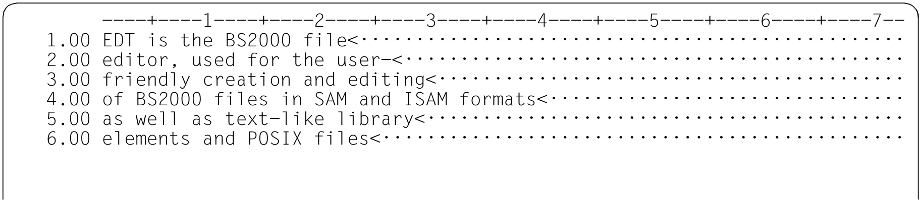 | (5) | EDT is to be switched to the F mode screen dialog and the work window is to be output on the screen. It is then possible to input all F and L mode statements in this dialog mode. The F mode screen dialog is terminated with @END, @HALT or @RETURN or K1 and processing continues with the statement following @DIALOG. |