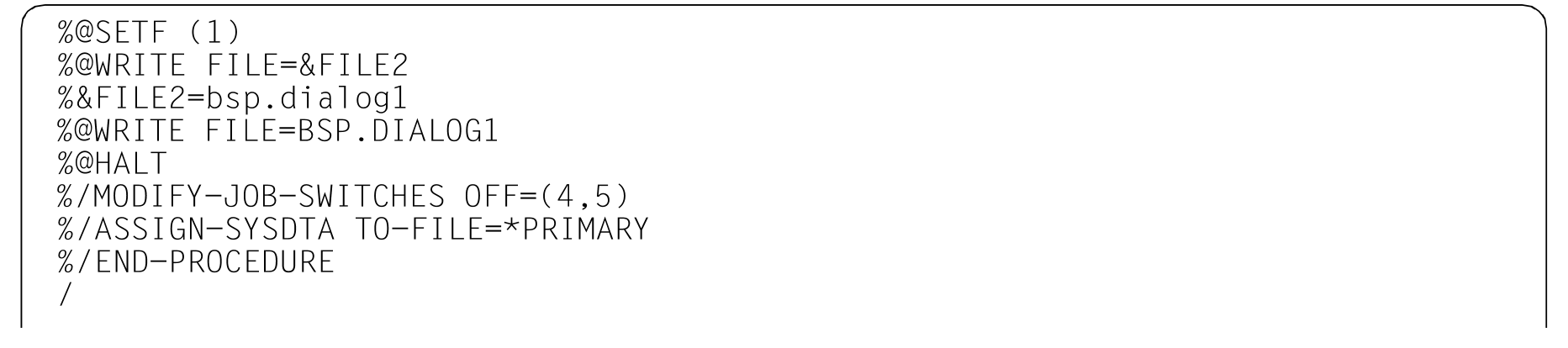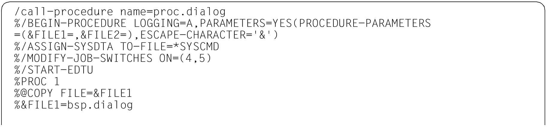 /BEGIN-PROCEDURE LOGGING=A,PARAMETERS=YES(/ PROCEDURE-PARAMETERS=(&FILE1=,&FILE2=),/ ESCAPE-CHARACTER='&') /ASSIGN-SYSDTA TO-FILE=*SYSCMD /MODIFY-JOB-SWITCHES ON=(4,5) ------------------------------------------- (1) /START-EDTU @PROC 1 ----------------------------------------------------------------- (2) @COPY FILE=&FILE1 ------------------------------------------------------- (3) @PAR SCALE=ON ----------------------------------------------------------- (4) @DIALOG ----------------------------------------------------------------- (5) @SETF(1) ---------------------------------------------------------------- (6) @WRITE FILE=&FILE2 ------------------------------------------------------ (7) @HALT ------------------------------------------------------------------- (8) /MODIFY-JOB-SWITCHES OFF=(4,5) /ASSIGN-SYSDTA TO-FILE=*PRIMARY /END-PROCEDURE