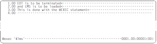 As far as the handling of unsaved files and the related security queries is concerned, @EXEC acts in the same way as the @HALT statement (see section “Terminating an EDT session”). Since EDT is always terminated, save queries may, unlike in the case of @HALT, also be issued if the statement was entered in the screen dialog (started with @DIALOG).