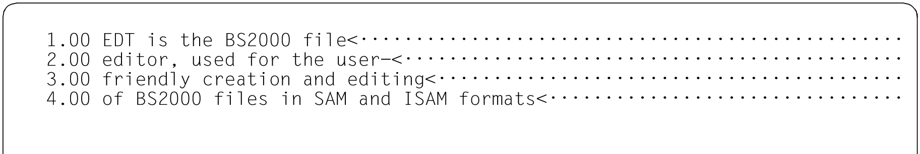 If the line number display is activated in F mode by specifying @INDEX ON, then, depending on the employed terminal and the way it has been set with the @VDT statement (72 or 124 characters per line), the 6 digit line number display is output with a decimal point and a protected blank for the visual separation of the line contents.