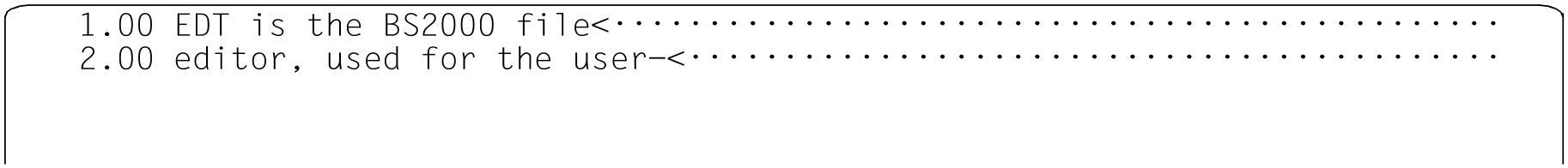 The statement line is interpreted in the character set that has been defined for communication with the terminal (see statement @CODENAME name,TERMINAL). It may therefore be necessary to convert the line from the work file's character set to this target character set. If, in such a case, it is not possible to convert individual characters then the message EDT5453 is issued. The statement is output nevertheless and the non-converted characters are replaced by question marks '?'.