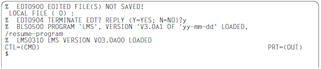 Since @LOAD was specified rather than @EXEC, a slash indicates that further system commands are expected. LMS is not started until the /RESUME-PROGRAM command is issued.