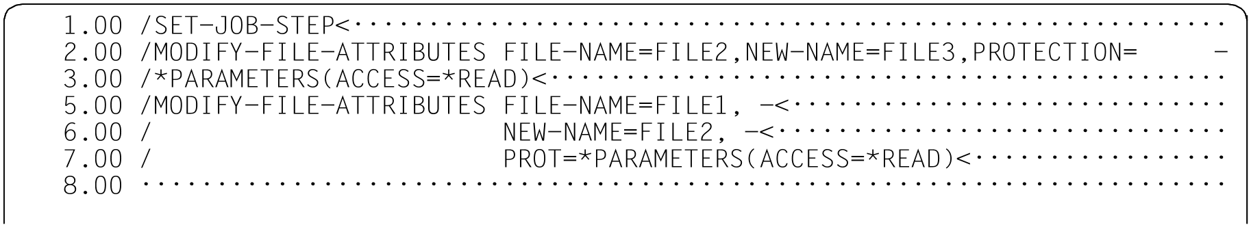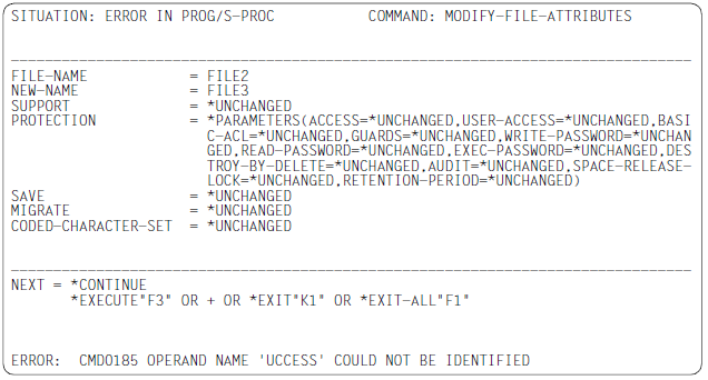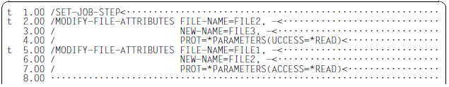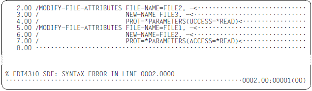 The verified command or statement overwrites the old command or statement in the work file together with all the continuation lines. If the command or statement is modified during verification by SDF (for example because LOGGING=INVARIANT was set in a preceding /MODIFY-SDF-OPTIONS command) then the affected lines are reformated and split into multiple continuation lines if necessary. The continuation character is set in the 72nd column.