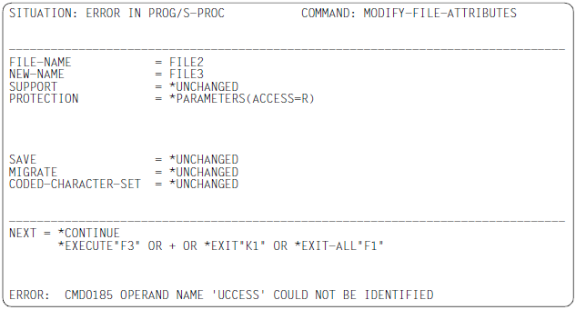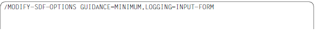 If the SDF syntax is correct or has been corrected then the text is entered in the work file. The format in which the statement is taken over depends on the SDF LOGGING option (see the description of the command /MODIFY-SDF-OPTIONS).