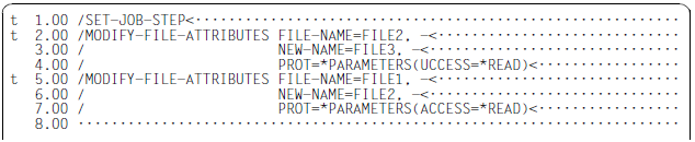 Lines that start with '/' or '//' and have the continuation character ('–') as their last character are chained with the continuation line if this also starts with '/' or '//' and the two lines are passed to SDF together when the statement code T is executed. It is not necessary to specify the statement code T in continuation lines. The specification in the first line is enough.