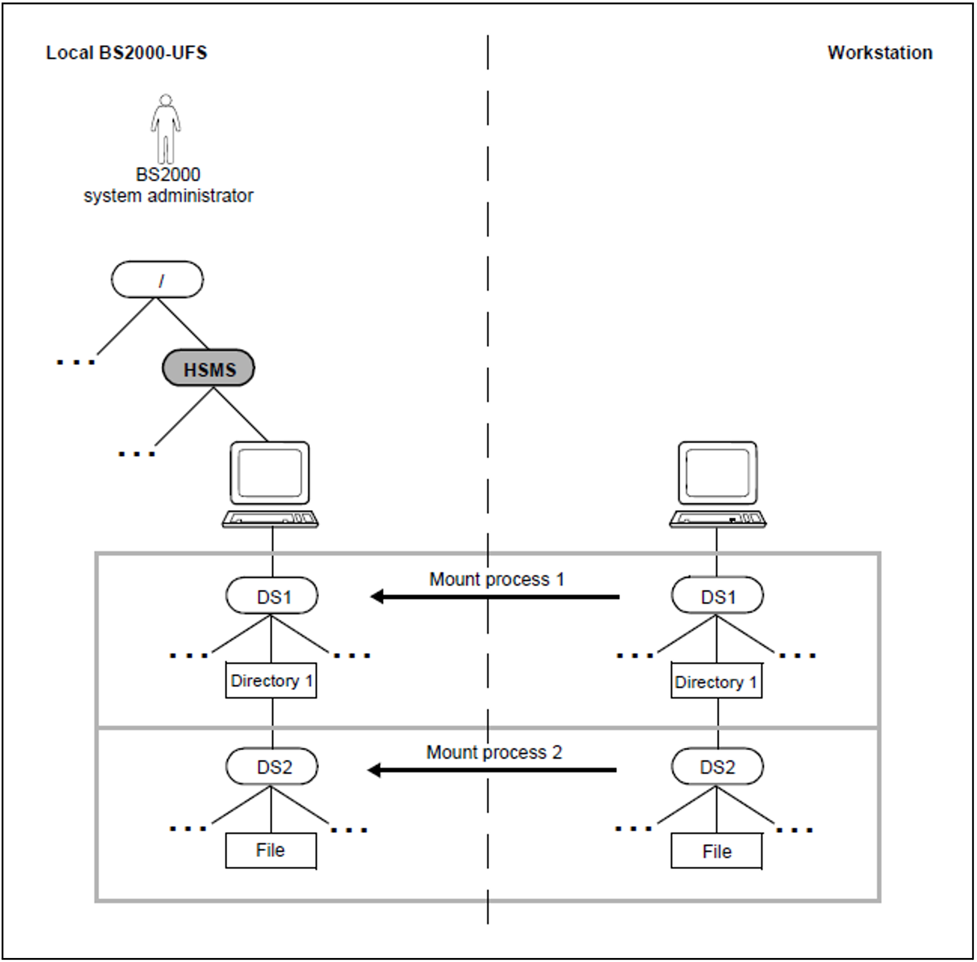 In order to be able to save data from a workstation or restore data to a workstation using NFS, each remote file system that is to be processed by HSMS must be mounted on the appropriate node “HSMS/<node-id>” of the local BS2000-UFS using NFS. If the file system is a subordinate file system within a workstation, it must be mounted at a lower directory level.