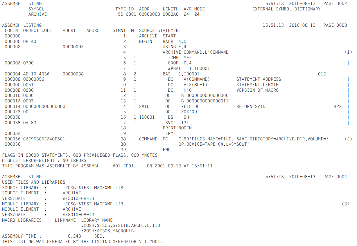 In the ARCHIVE macro, the operands COMMAND and L'COMMAND specify the address and length respectively of the ARCHIVE statement in this Assembler program.