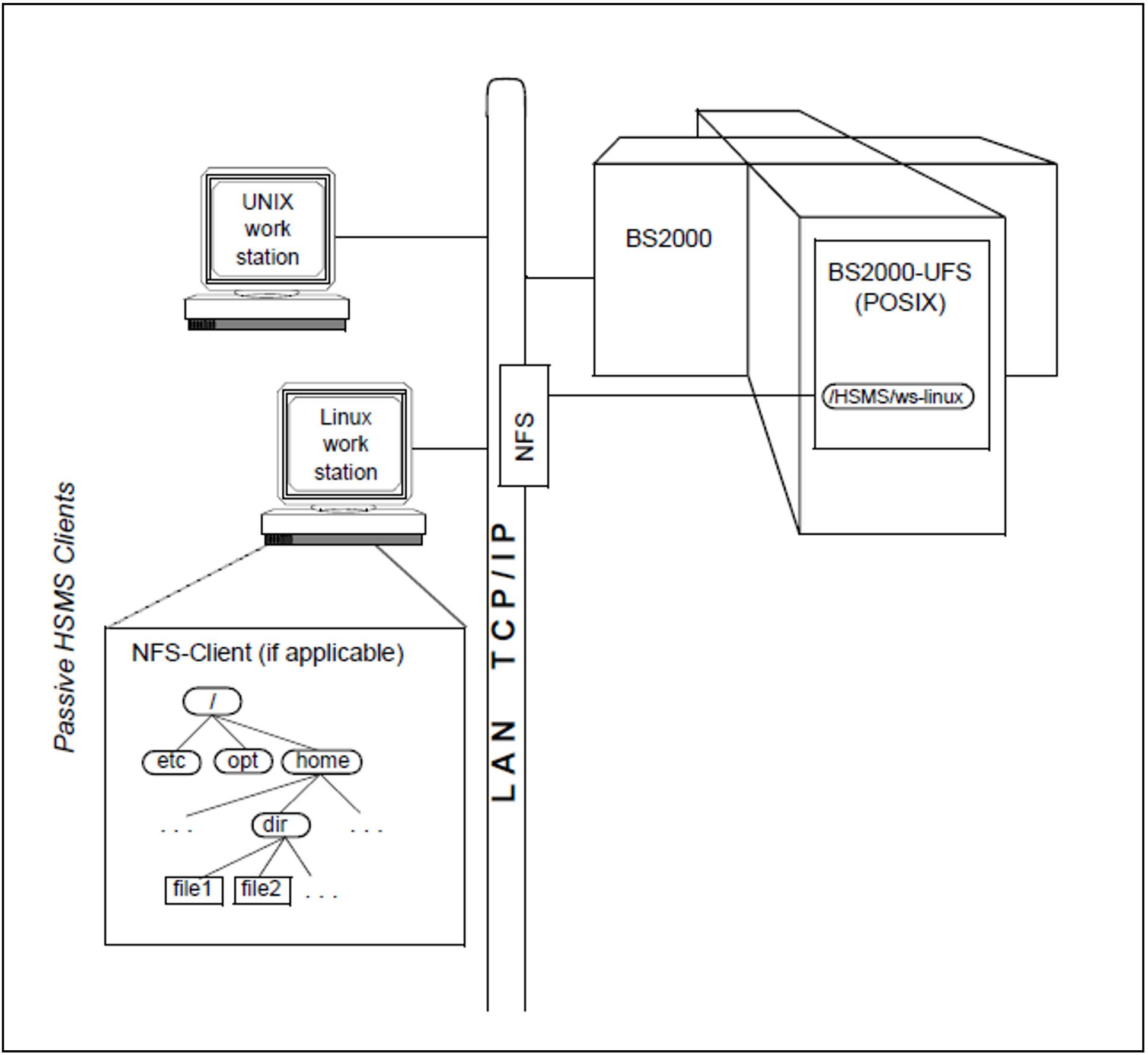 Files on this type of workstation are organized in UNIX file systems (UFS). A UNIX file system is a hierarchical tree structure consisting of files and directories. The origin of this hierarchy is the root directory whose path name is the slash (/). From here the directory structure proceeds downwards. Each directory subordinated to the root directory can have subdirectories or files of its own. Files constitute the lowest level of this hierarchy. From a file no further branch is possible.
