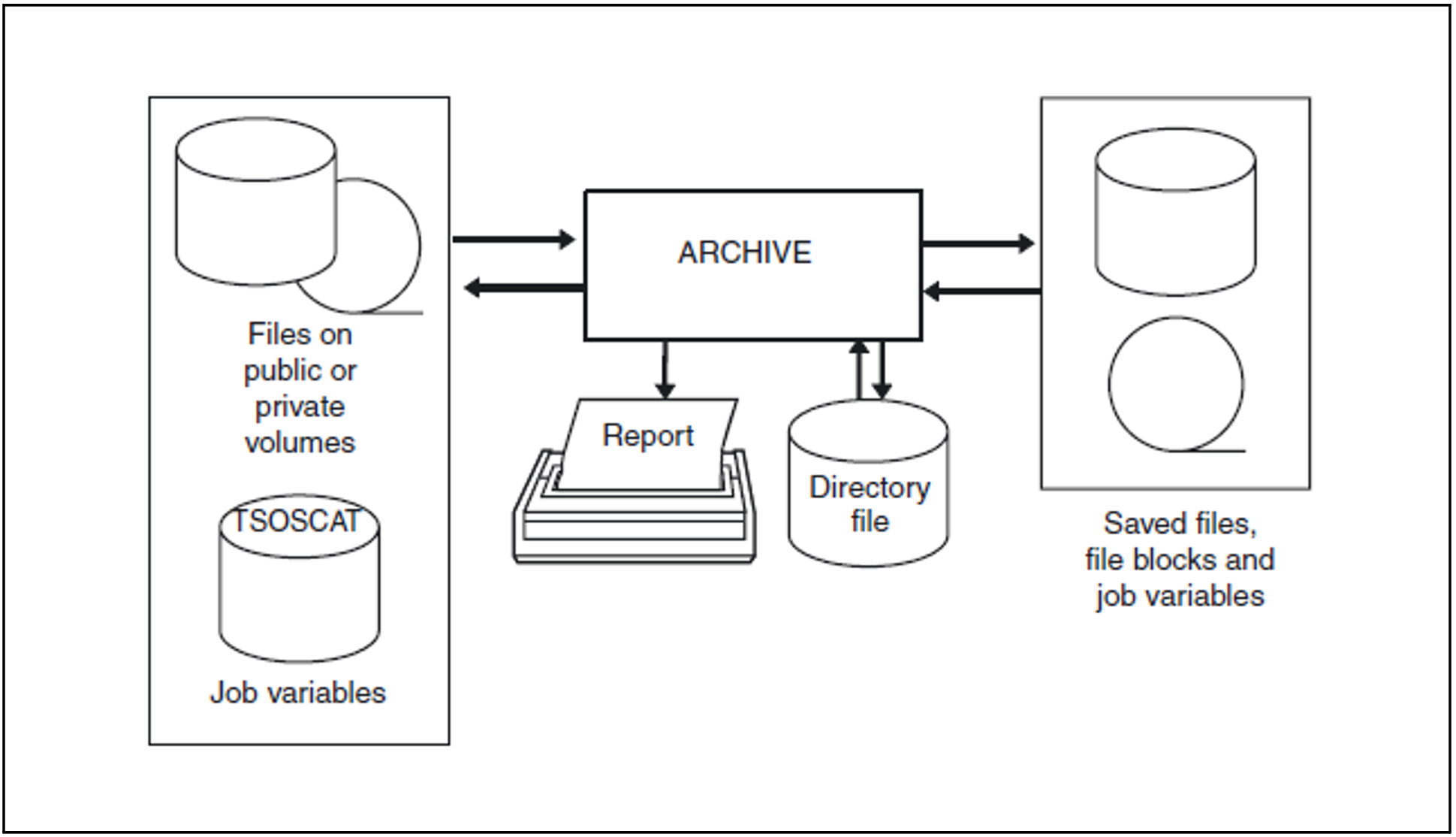 ARCHIVE can be used to save files, file blocks, and catalog entries of files and job variables on tape, MT cartridge or disk. The data is saved in so called save files.