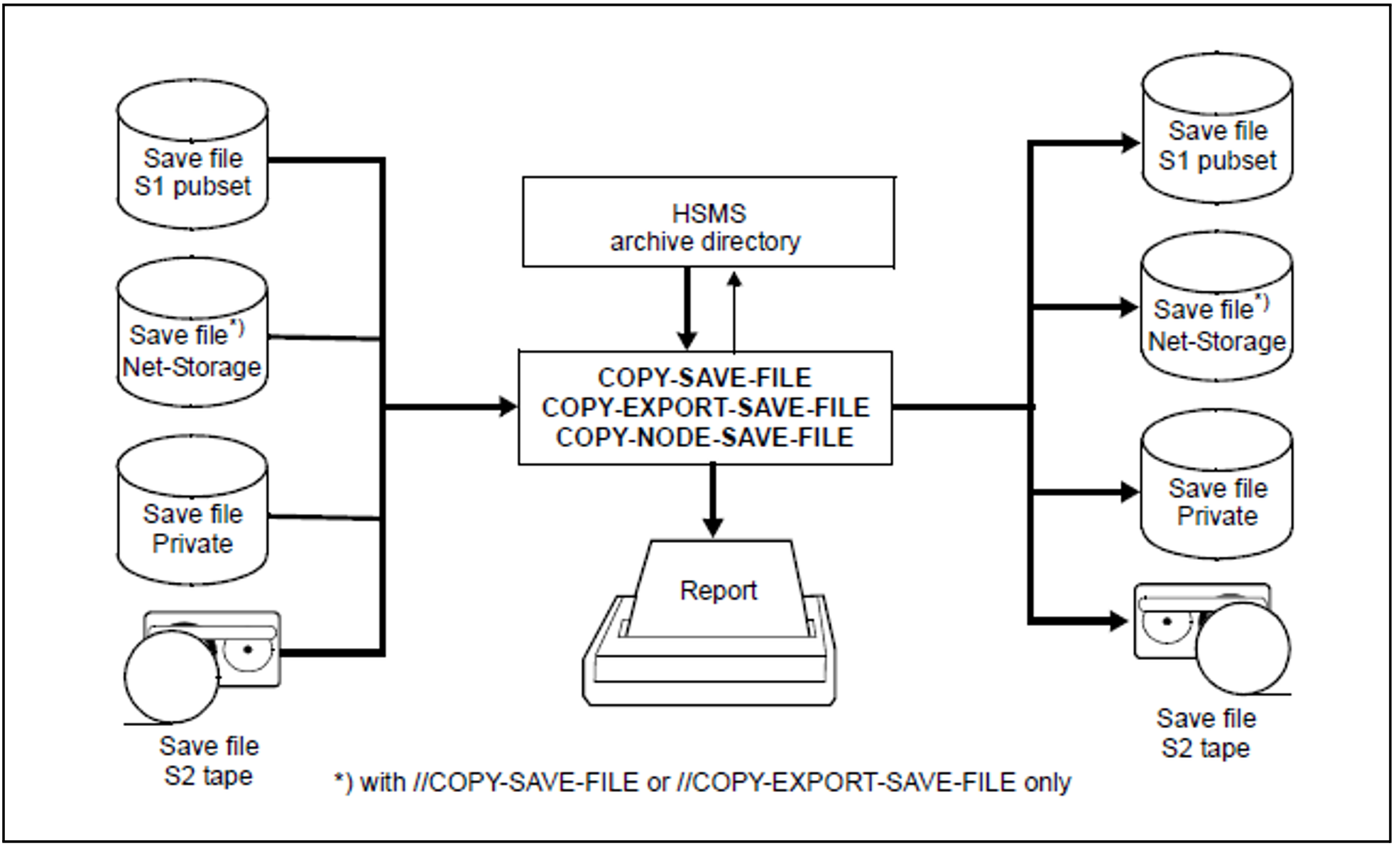 Save files can be copied using the HSMS statements COPY-SAVE-FILE, COPY-NODE-SAVE-FILE and COPY-EXPORT-SAVE-FILE.
