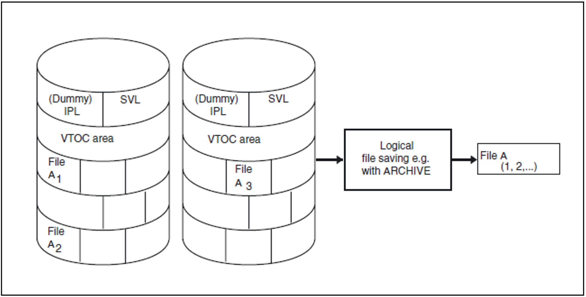 In logical data saving, files (and job variables) are read from one or more volumes and written as one unit to one or more volumes. Logical data saving thus supports file-specific handling.