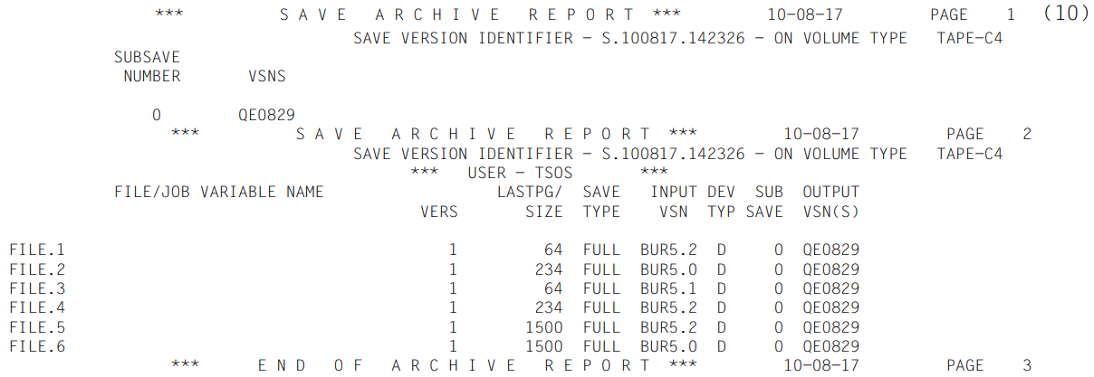 (10) | Report of the save run. The processed files are listed. The meanings of the columns are explained in section "ARCHIVE report". |