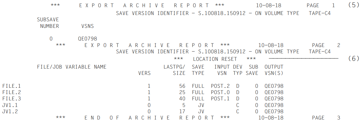 (5) | Report of the EXPORT run. The processed files are listed. The meanings of the columns are explained in section "ARCHIVE report". |