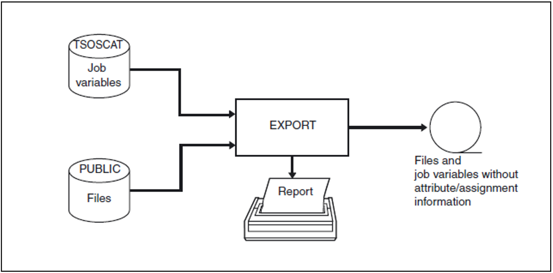 Transferring files and job variables on MT cartridge so that they can be processed without assignments (catalog ID and user ID) and without information about password and access attributes.