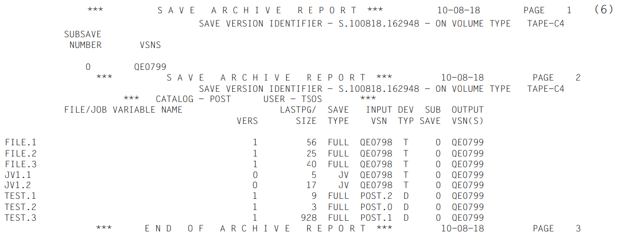 (6) | Report of the save run. The processed files are listed. The meanings of the columns are explained in section "ARCHIVE report". |
