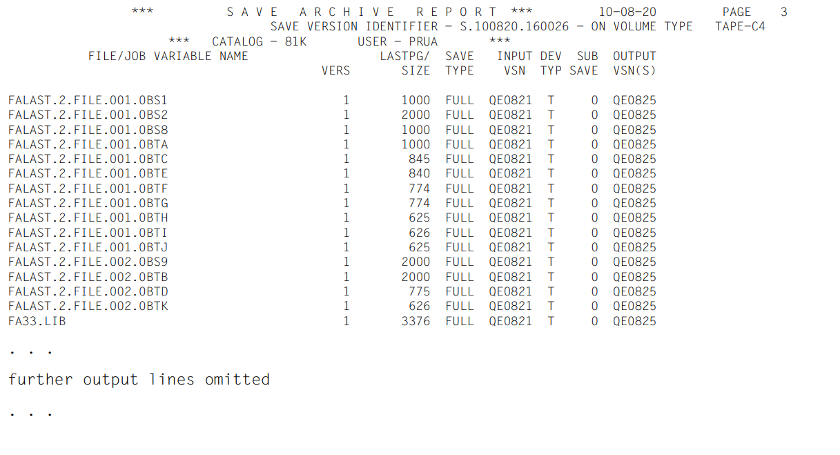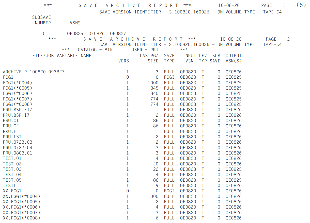(5) | Report of the save run. The processed files are listed. The meanings of the columns are explained in section "ARCHIVE report". |