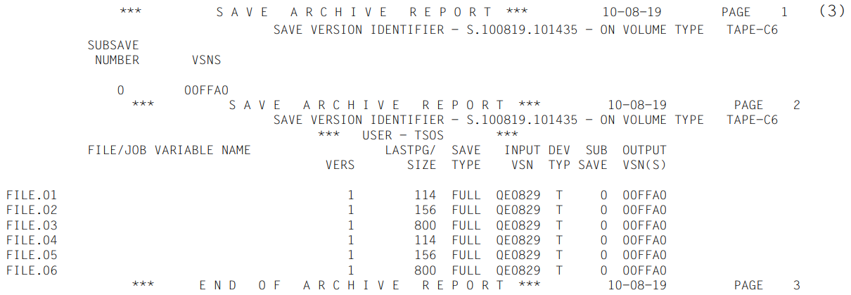 (3) | Report of the save run. The processed files and job variables are listed. The meanings of the columns are explained in section "ARCHIVE report". |