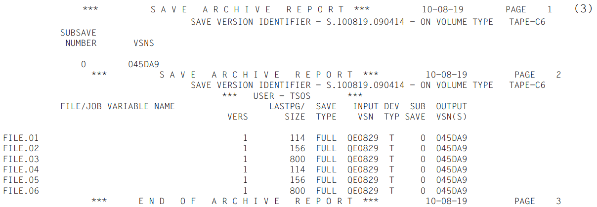 (3) | Report of the save run. The processed files are listed. The meanings of the columns are explained in section "ARCHIVE report". |