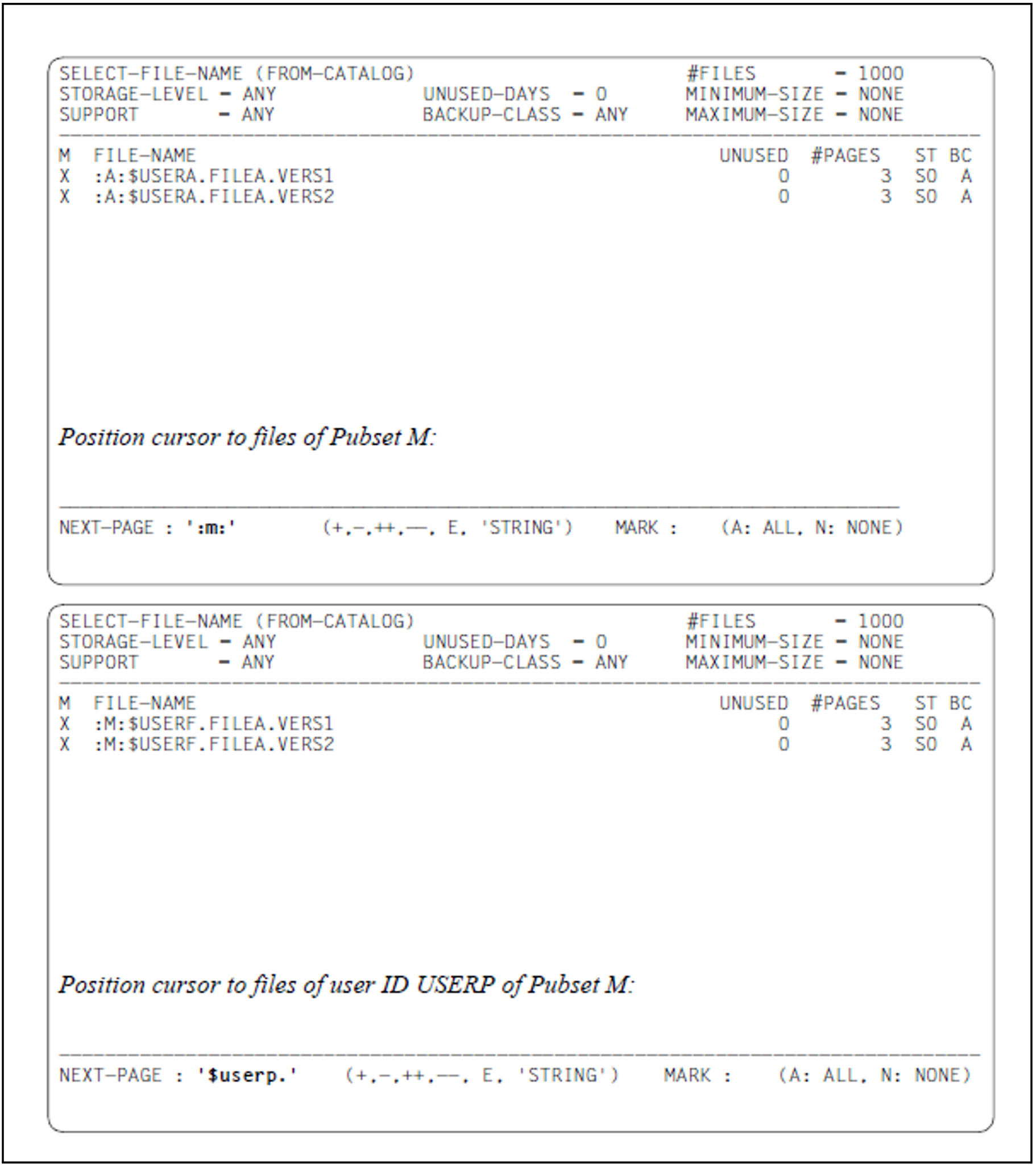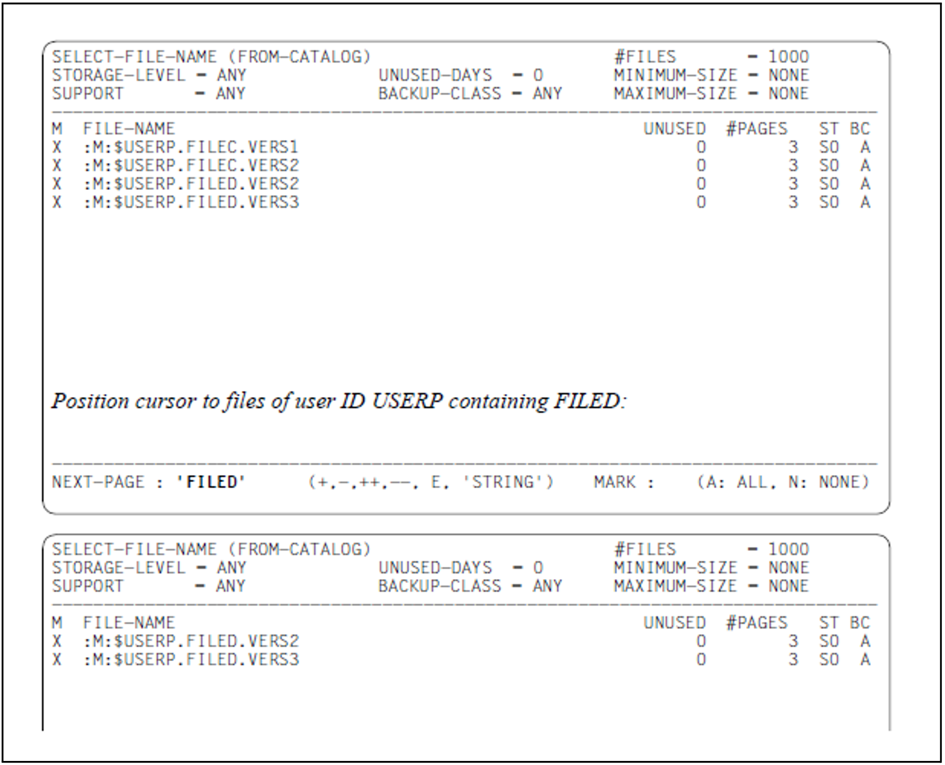 In the case of both SELECT-FILE-NAMES and also some action statements, a further selection can be made in the list which was generated according to the criteria specified: the files in the list are presented in screen masks when DIALOG-FILE-SELECT=*YES. The files can be highlighted to select or exclude them individually or by the screenful.