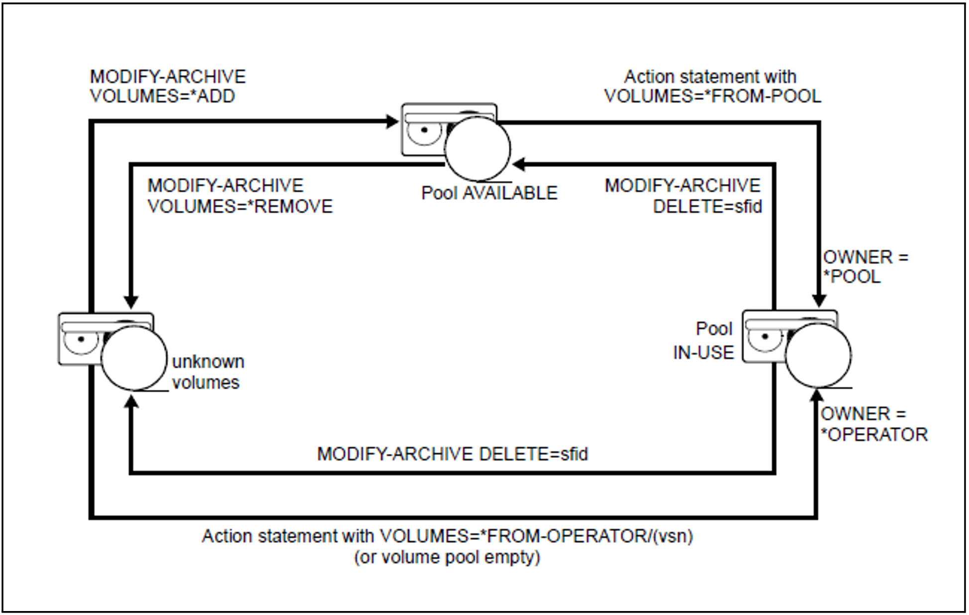 When VOLUMES=*FROM-POOL is specified, the volumes are taken from the volume pool of the archive which has been created in the directory. If no volume pool has been created or this pool is exhausted, the tapes are allocated from an assigned MAREN pool using MAREN.