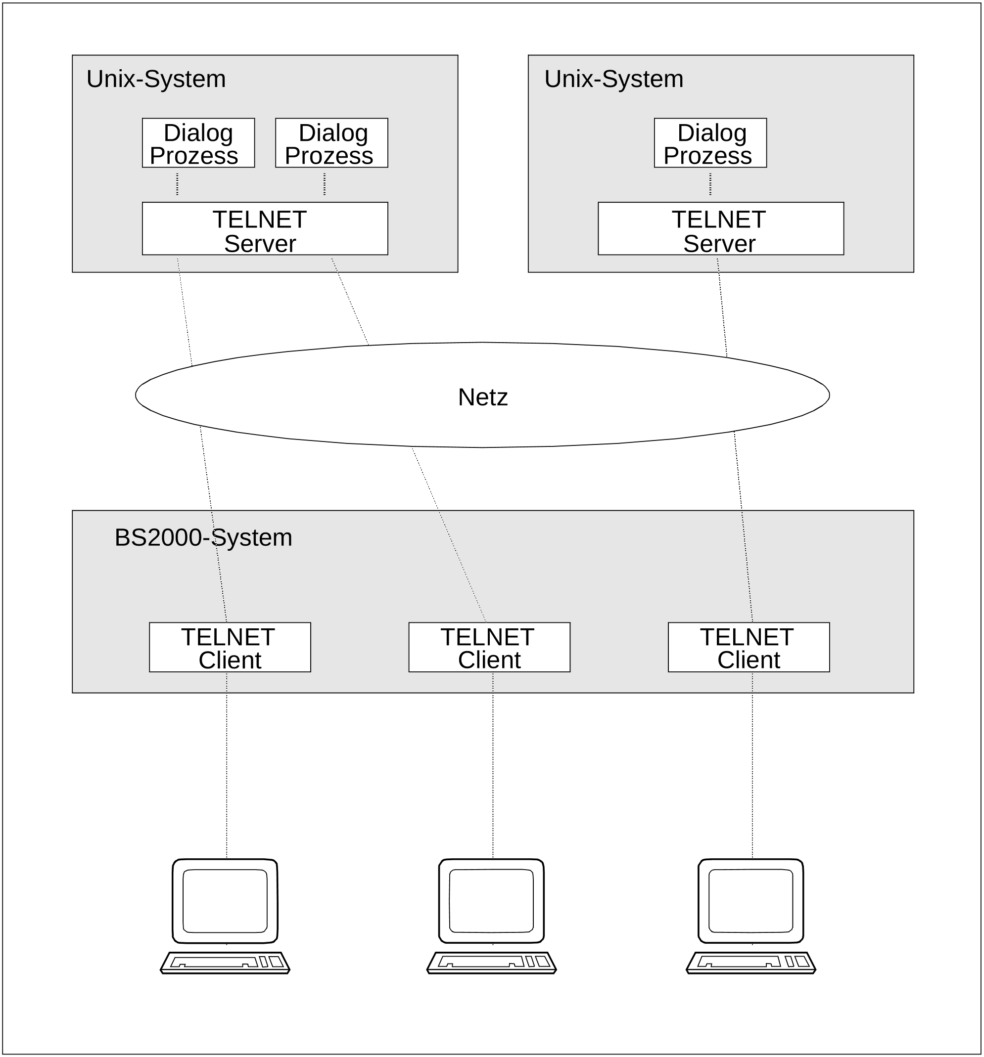 Jeder Anwender von TELNET im BS2000 eröffnet eine eigene TELNET-Client-Task. Beim Kommando open stellt der Client die Verbindung zum gewünschten TELNET-Server an einem fernen Rechner her.