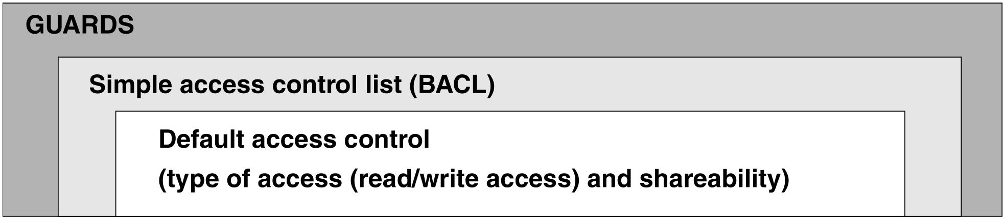 The use of passwords and the retention period (release date) is independent of the active protection mechanism, i.e. it is also possible for basic ACL and GUARDS. Access control (shareability and type of access) are further refined for these two protection mechanisms by creating three groups (OWNER, GROUP and OTHERS) for basic ACL and by creating access profiles for individual users for GUARDS.