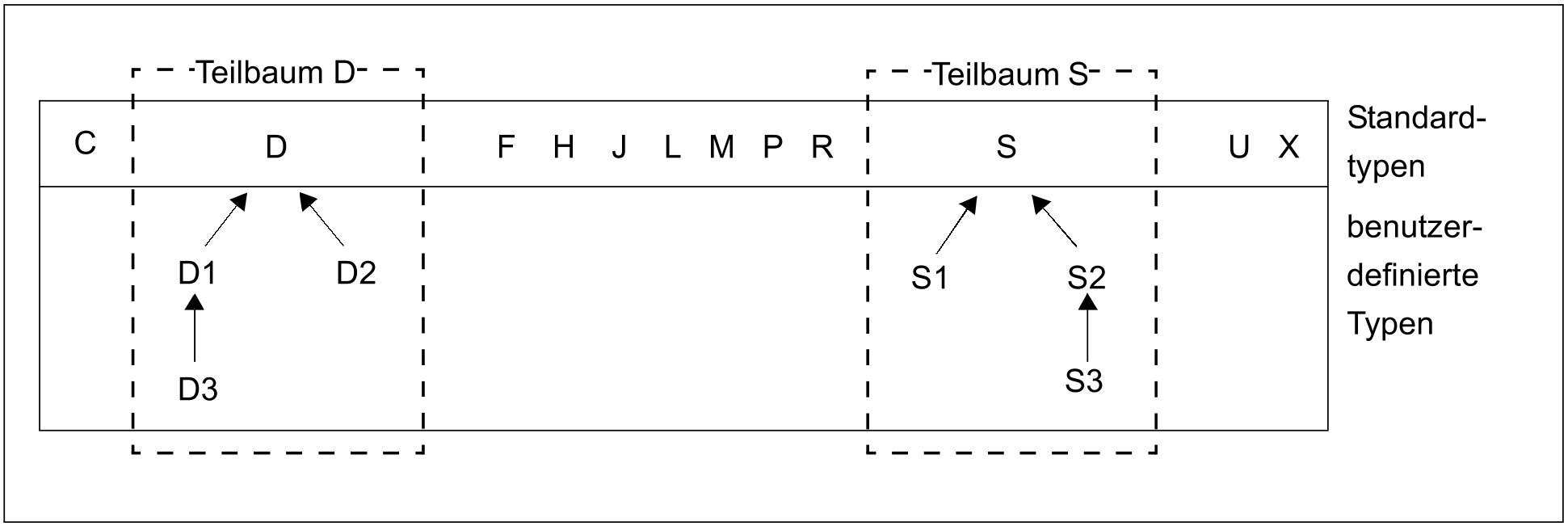 Neben den Standardtypen kann der Anwender auch eigene Typen, sog. benutzerdefinierte Typen, verwenden. Benutzerdefinierte Typen sind zwischen zwei und acht Zeichen lang und beginnen nicht mit $ oder SYS. Die Verwendung von benutzerdefinierten Typen anstelle von Standardtypen in allen Kommandos und Programmen ist durch einen Umlenkmechanismus möglich (siehe Abschnitt „Zuweisen von Bibliotheken“ (5.2 Zuweisen von Bibliotheken)).