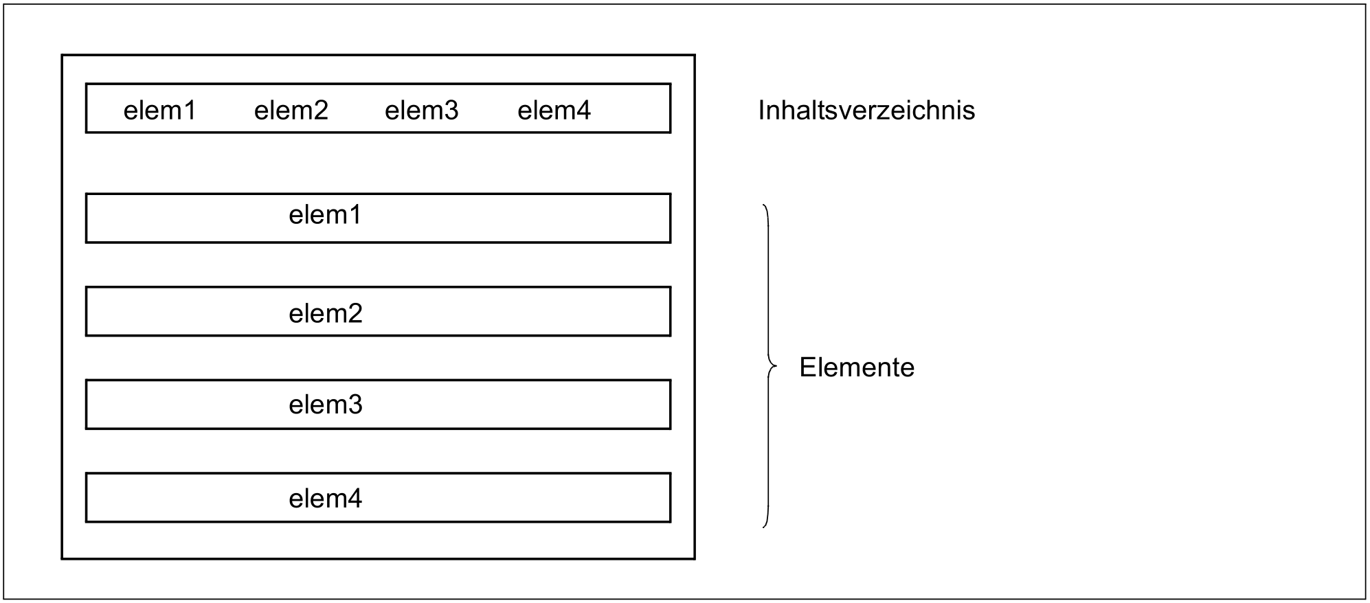 Eine Bibliothek ist eine Datei mit Unterstruktur. Sie enthält Elemente und ein Inhaltsverzeichnis.
