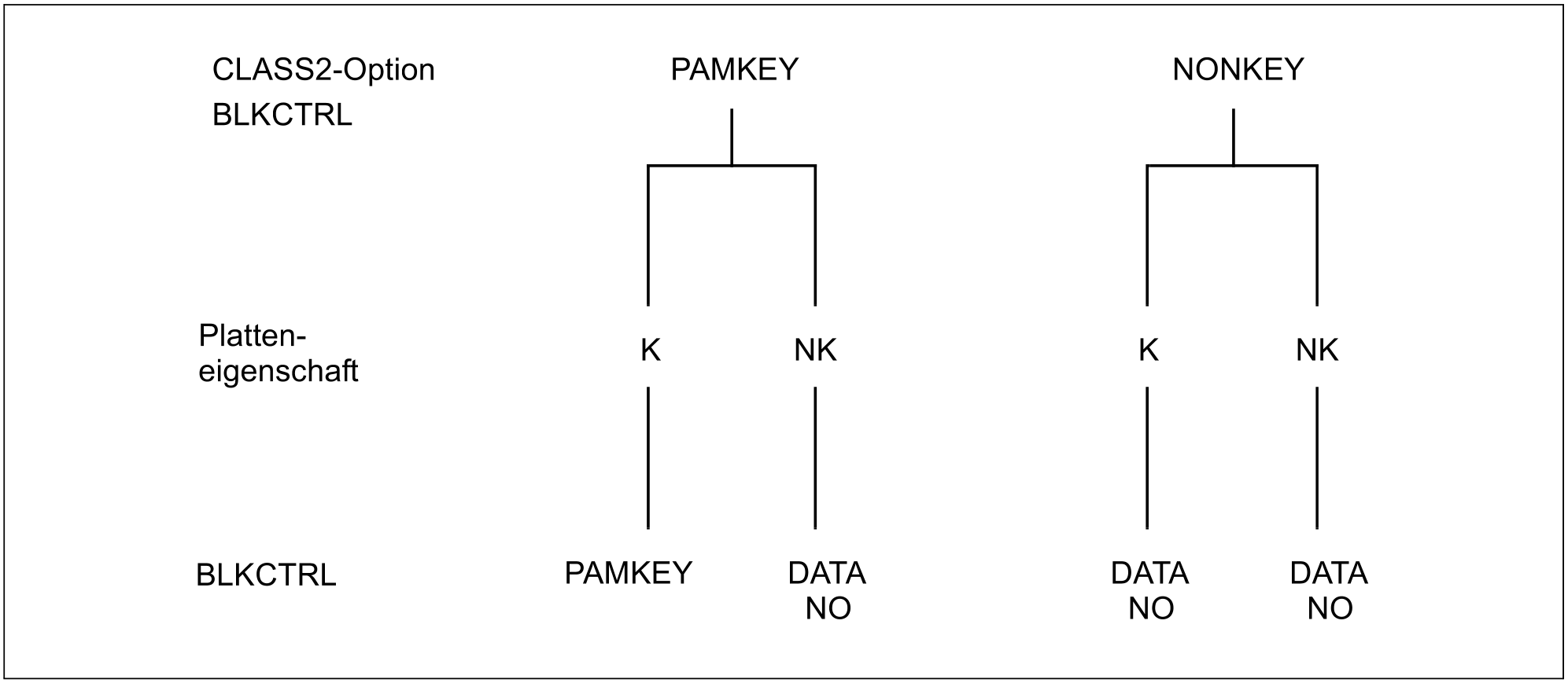 Ist kein Katalogeintrag vorhanden und der BLKCTRL-Wert nicht gespeichert, so entscheidet die CLASS2-Option und die Platteneigenschaft über den BLKCTRL-Wert: