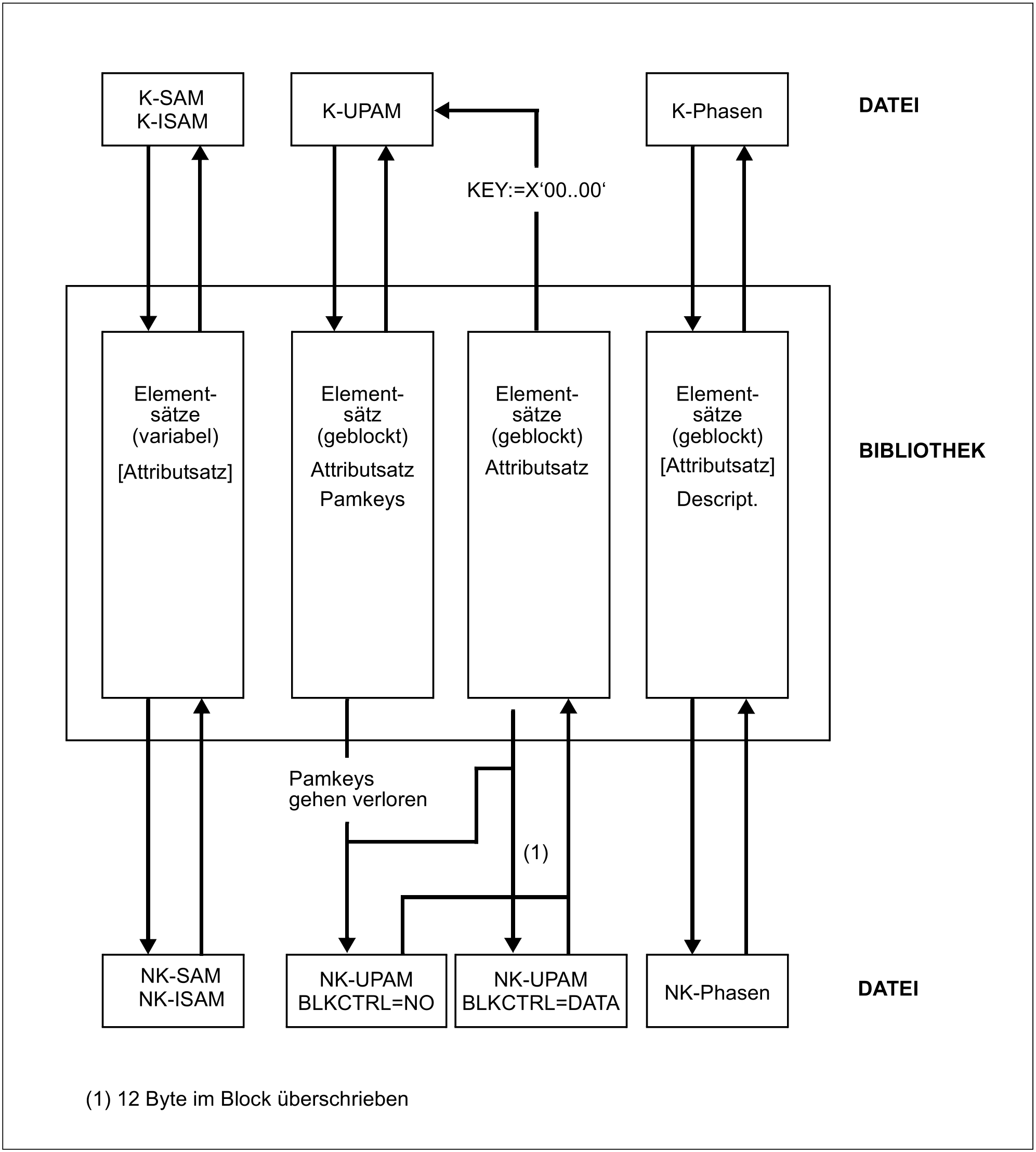 Bei Aufnahme von PAM-Dateien wird der BLKCTRL-Wert generell mit abgespeichert. Die Blöcke der Datei werden über die Zugriffsmethode UPAM gelesen und unverändert als Block im Element gespeichert. Sind PAM-Schlüssel vorhanden, d.h. BLKCTRL= PAMKEY, so werden diese PAM-Schlüssel beim Element abgelegt.
