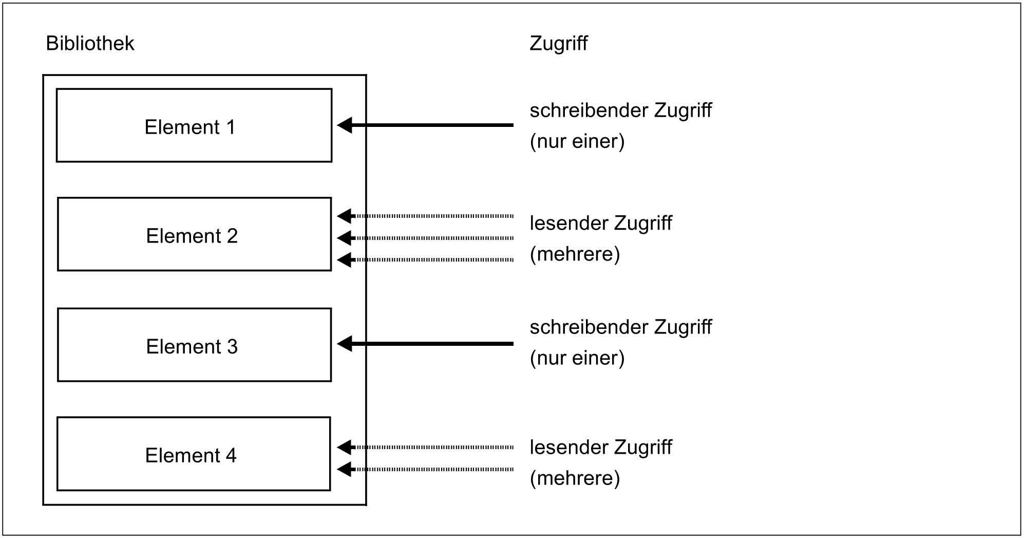 Ein Voll-Element kann gleichzeitig von mehreren Benutzern gelesen, jedoch nur von einem geschrieben werden. Während ein Voll-Element zum Schreiben eröffnet ist, kann kein anderer Zugriff - auch kein lesender - auf dieses Element erfolgen, jedoch auf andere Voll-Elemente der Bibliothek.