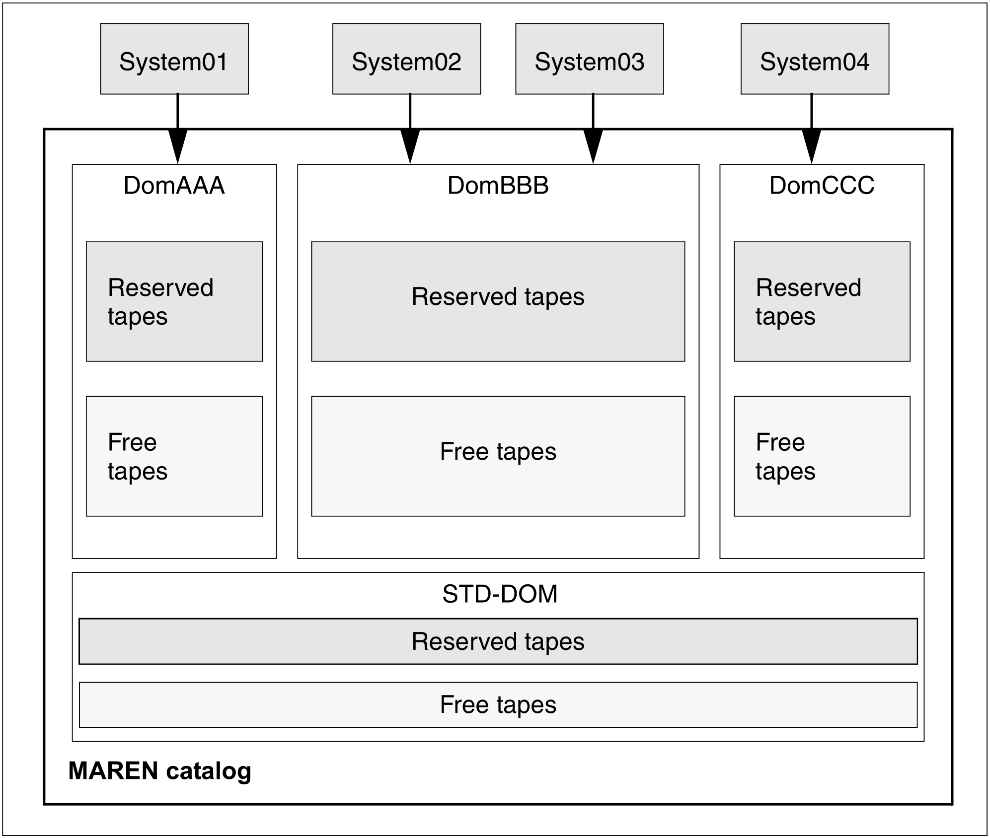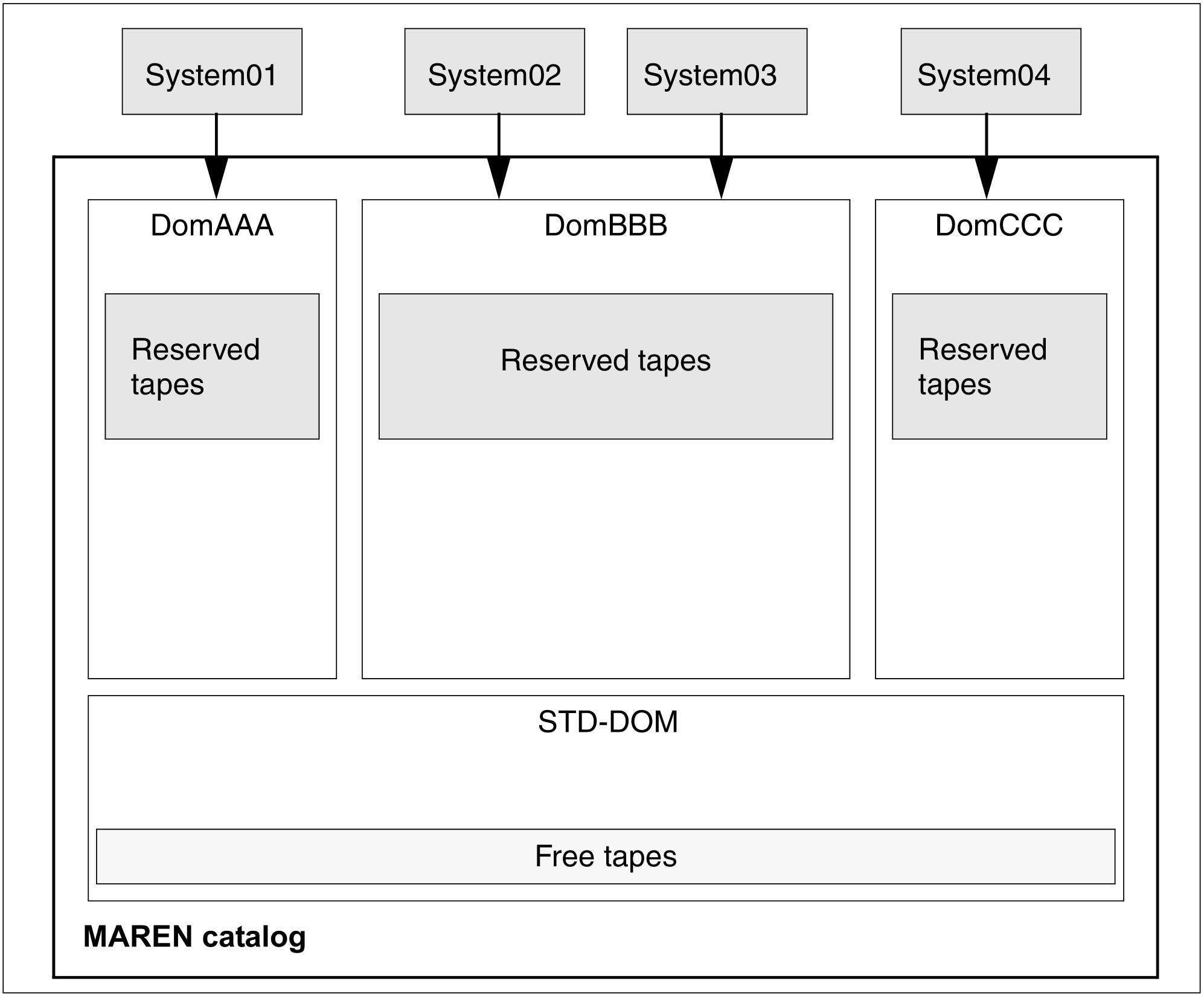 A domain consists not only of the systems, but also of the tapes which are processed on these systems. The MAREN catalog contains this assignment of tapes to domains.