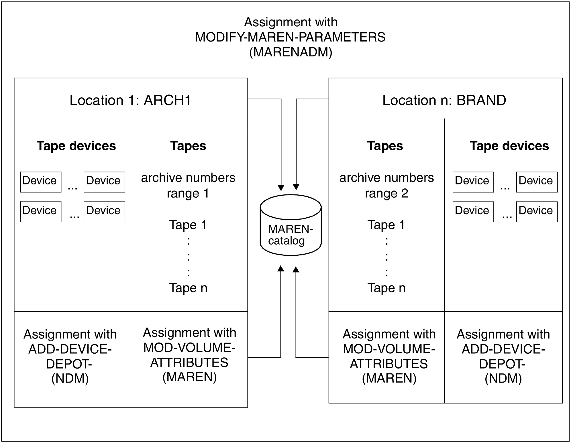 The tapes are allocated to the locations via their archive numbers using the MARENADM statement MODIFY-VOLUME-ATTRIBUTES. Depending on their use, tapes can reside in three types of location: