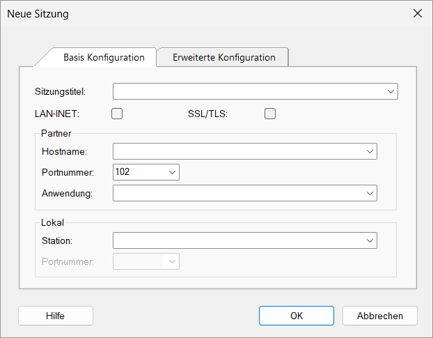Für weitere Informationen siehe Abschnitt „Einrichten einer Sitzung im LAN-INET-Format“.- Geben Sie im Abschnitt Partner den Hostnamen sowie (optional) die Host-Anwendung an, mit der Sie arbeiten wollen, z. B. $DIALOG. Standardmäßig ist die Portnummer 102, der Standard-Port von RFC1006-Verbindungen, eingetragen. Dieser Wert kann nicht verändert werden.