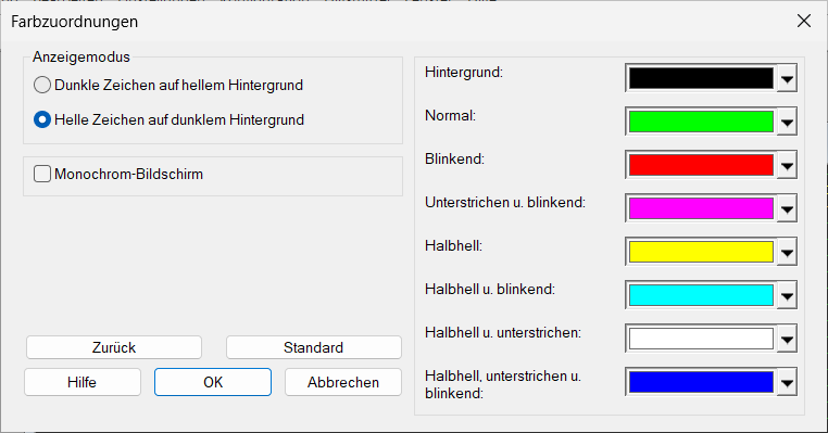 Im Menü Einstellungen > Farben können Sie für jede der vom Host verwendeten Farbe eine Ersatzfarbe aus der Farbpalette auswählen. Die Farbpalette richtet sich nach dem unter Windows installierten Grafiktreiber.