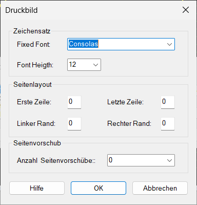 - Sie können zusätzlich das Druckbild (Zeilenlänge, Seitenlänge, Zeichengröße usw.) verändern; wählen Sie dazu Druckbild. In diesem Dialogfeld können Sie weitere Informationen über die Hilfe-Schaltfläche aufrufen.