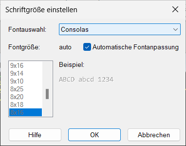 Die Auswahl der Fonts reicht von 6x10 Pixel bis 18x40 Pixel. Feste Fonts sind nur dann auswählbar, wenn die Option Automatische Fontanpassung nicht aktiv ist.