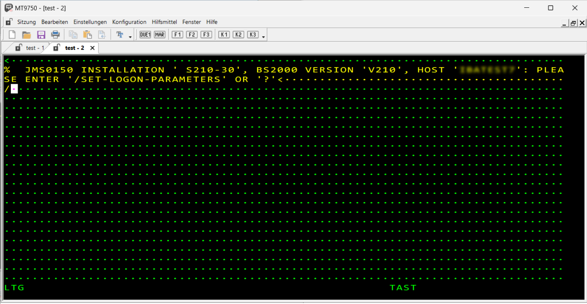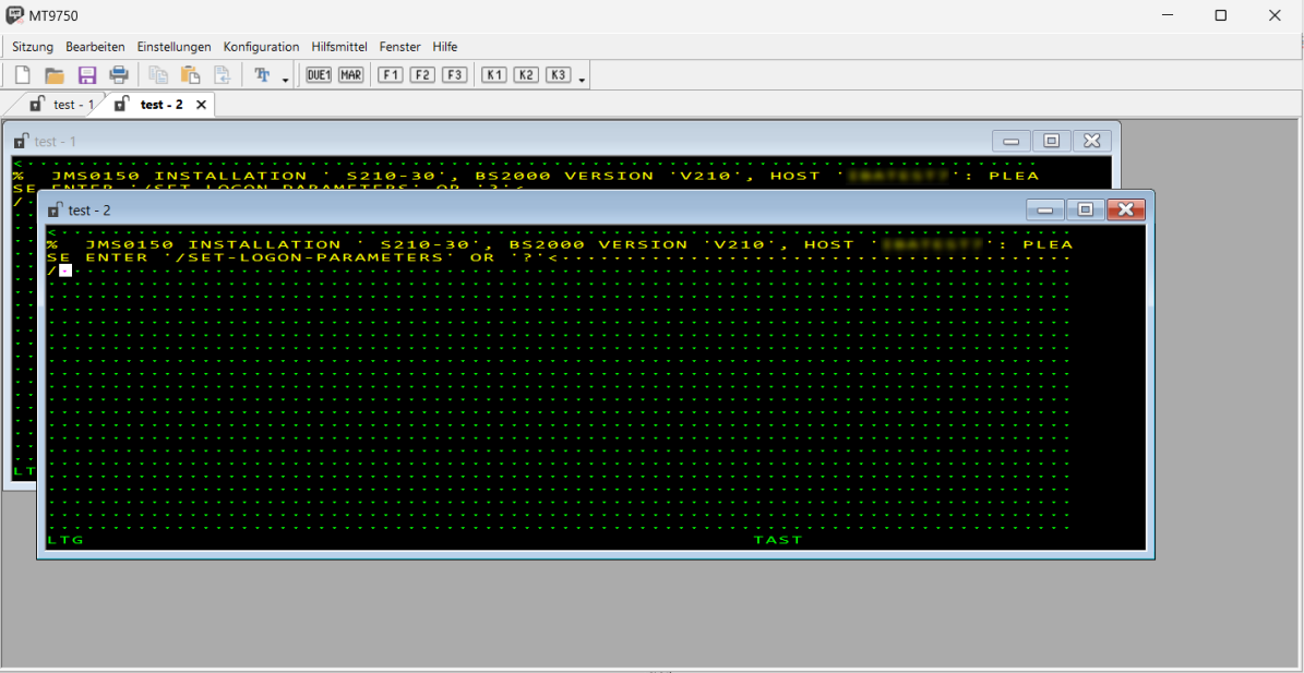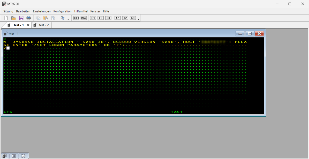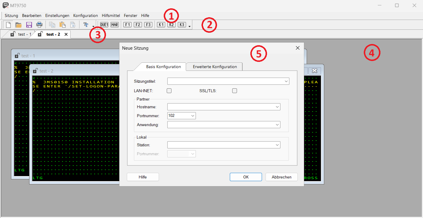 | (2) | Symbolleiste | Schneller Zugriff auf wichtige Aktionen wie Öffnen und Speichern von Sitzungen, Drucken, Kopieren und Einfügen, 9750 emulierte Tasten. |