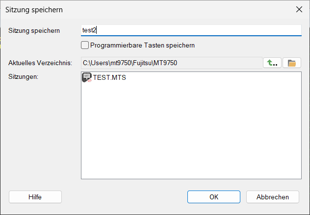 Sie können Ihre Sitzungen speichern, indem Sie einzelne Terminalfenster auswählen und die Funktion "Speichern" im Sitzungsmenü oder in der Symbolleiste verwenden. Sie können auch alle Sitzungen auf einmal speichern, indem Sie Sitzungen → Alle speichern auswählen. Für die Sitzungen, die zuvor nicht gespeichert wurden, wird der Dialog "Sitzung speichern" angezeigt: